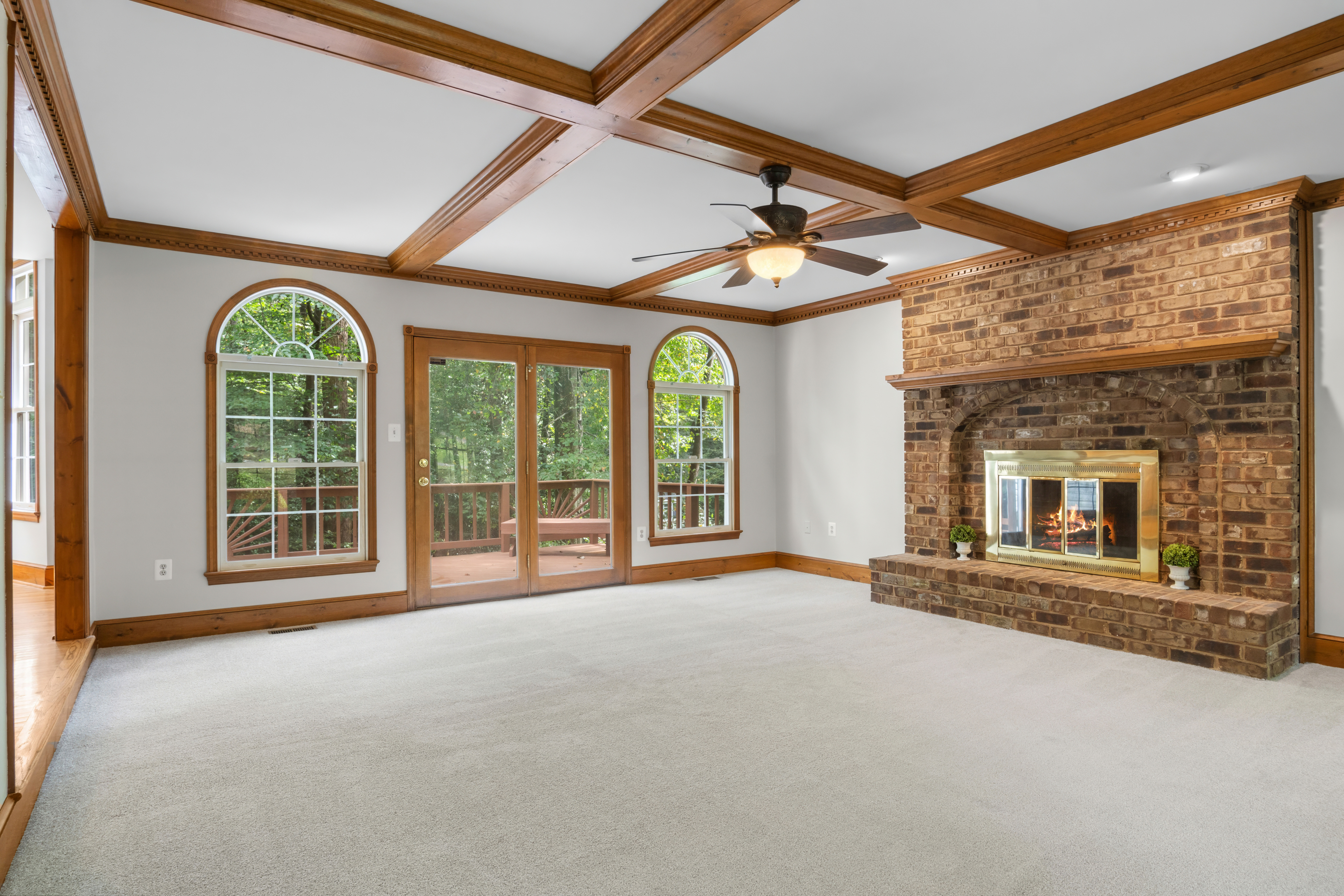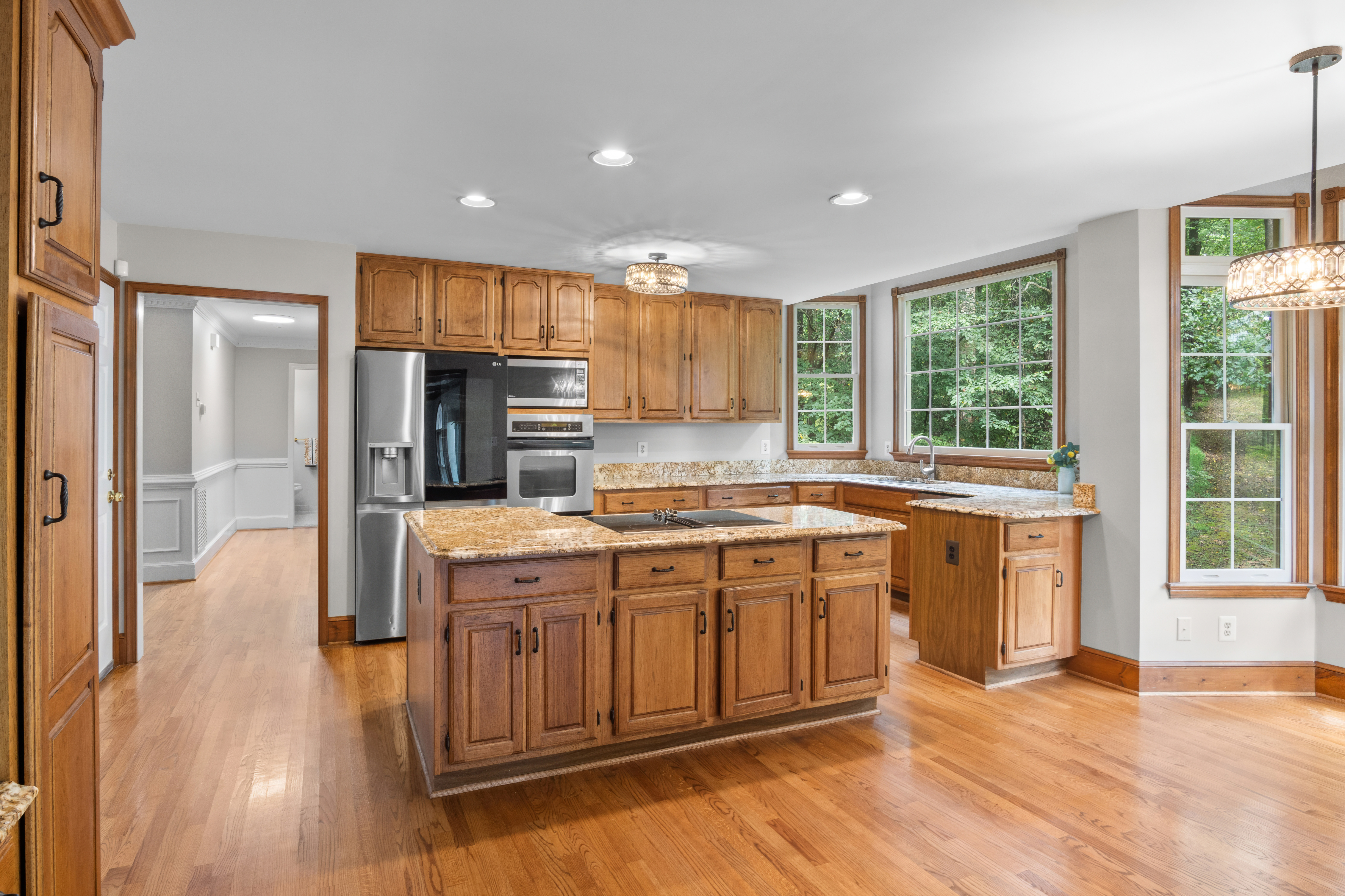 The heart of the home is the gourmet kitchen, featuring custom wood cabinetry, stainless steel appliances, and a generous center island—perfect for family meals or hosting gatherings. The kitchen flows seamlessly into the inviting family room with dramatic exposed beams on the ceiling, brick hearth and woodburning fireplace for cozy evenings at home. You can enjoy formal occasions in the elegant dining room and formal living room. The dedicated library/office with Palladian window provides space for working or studying from home.