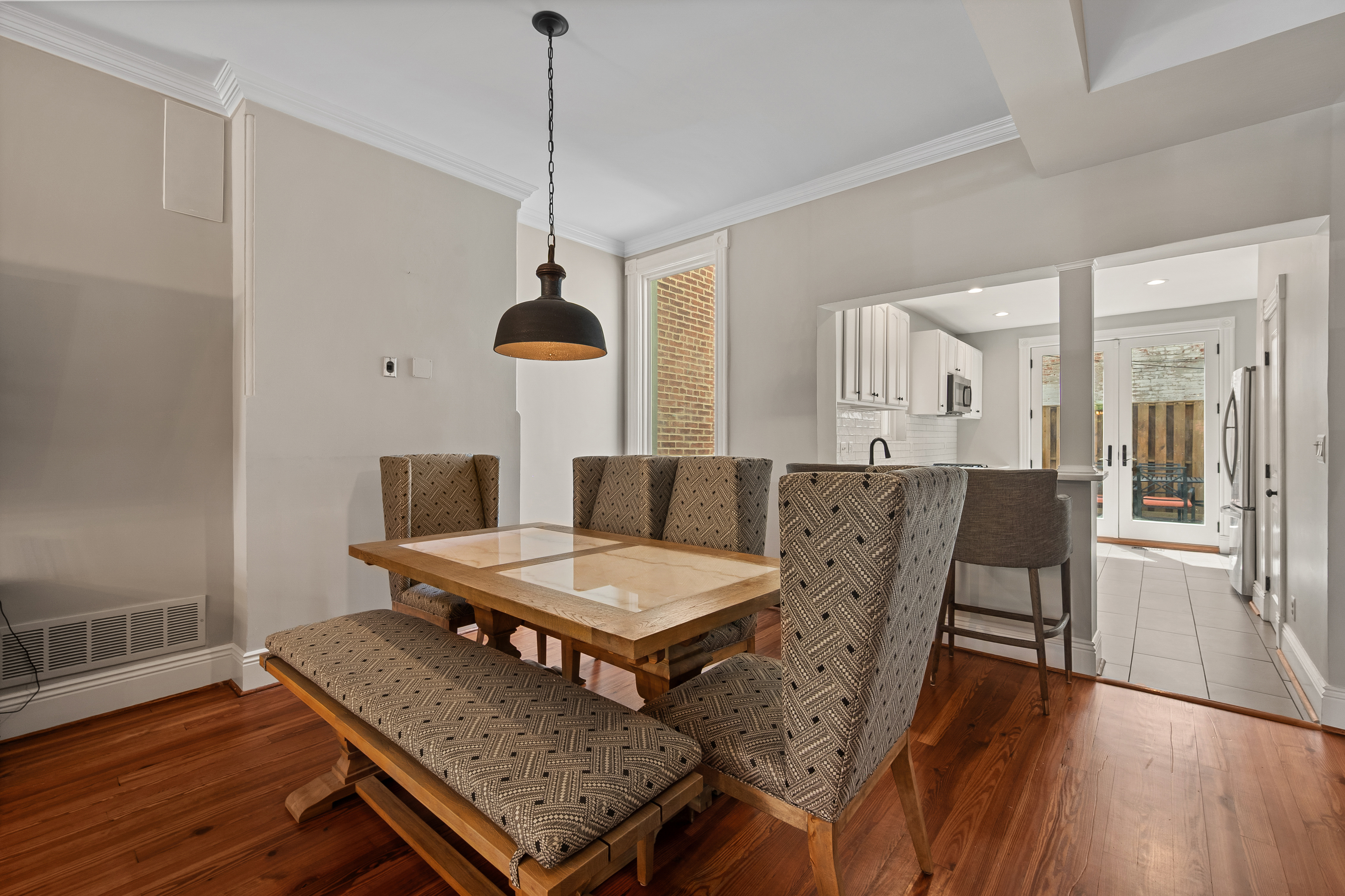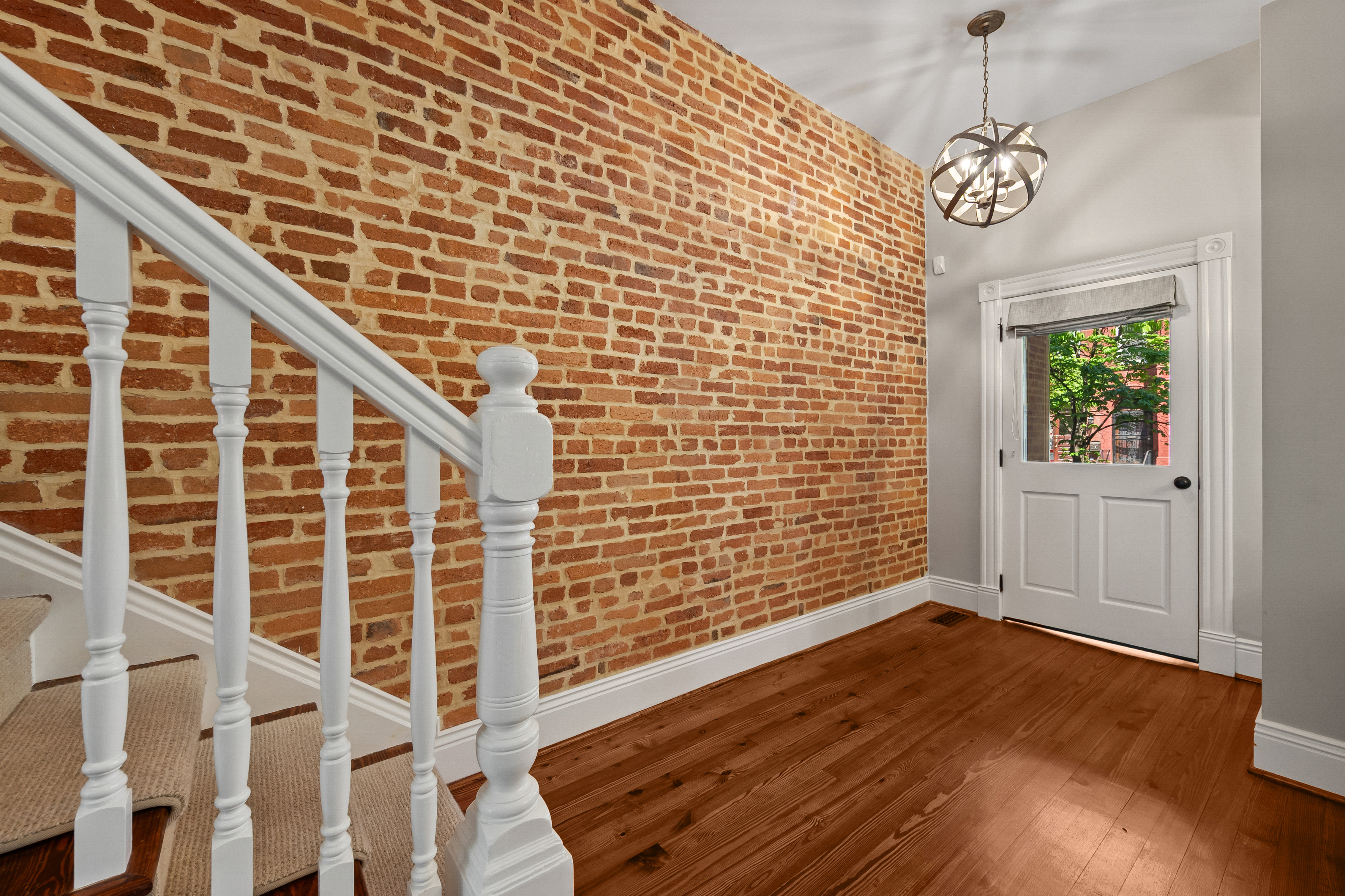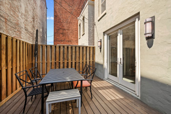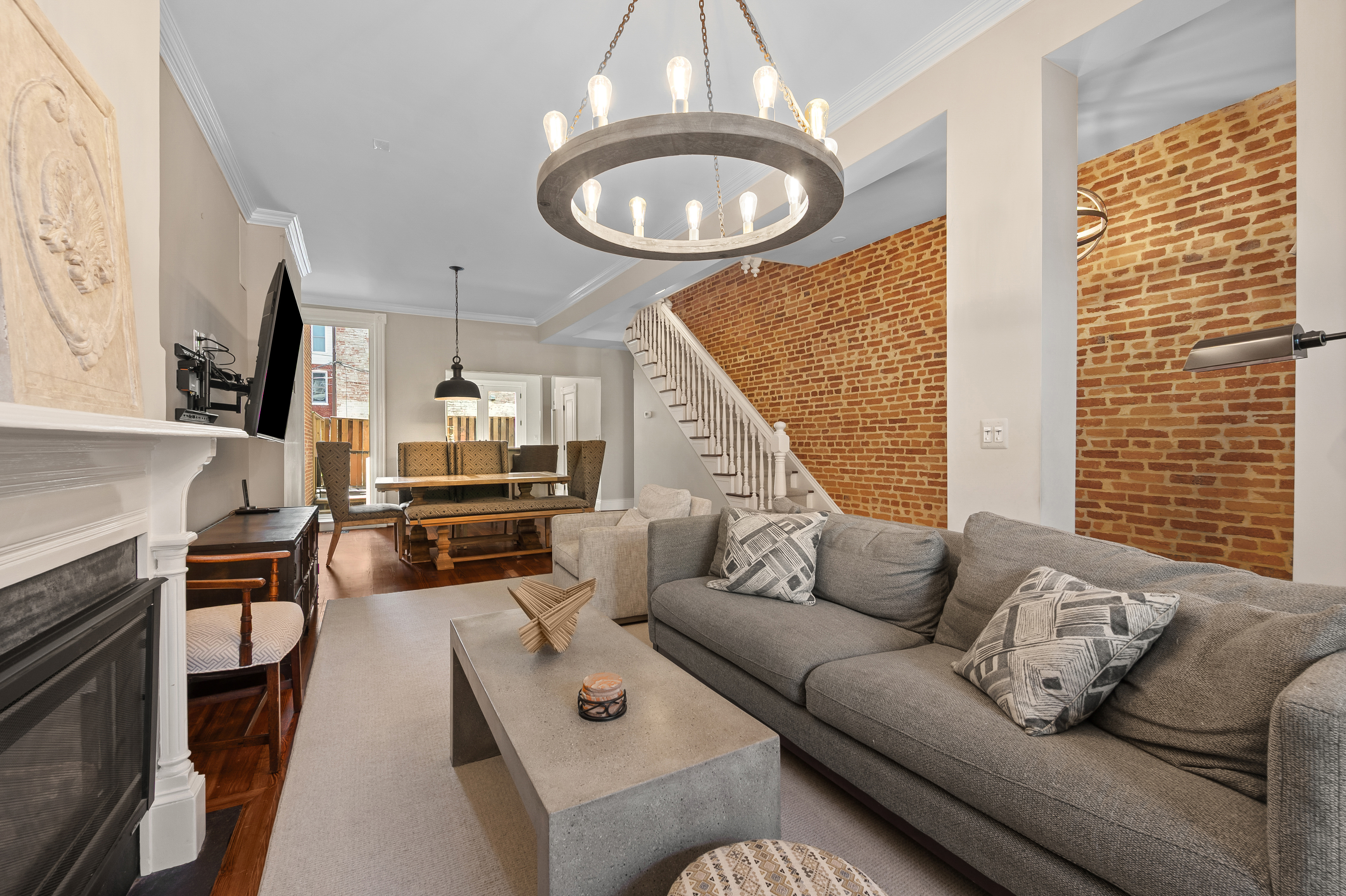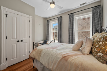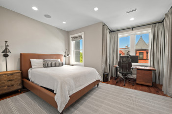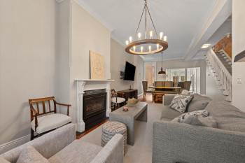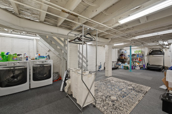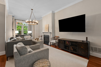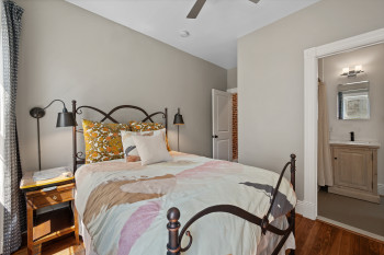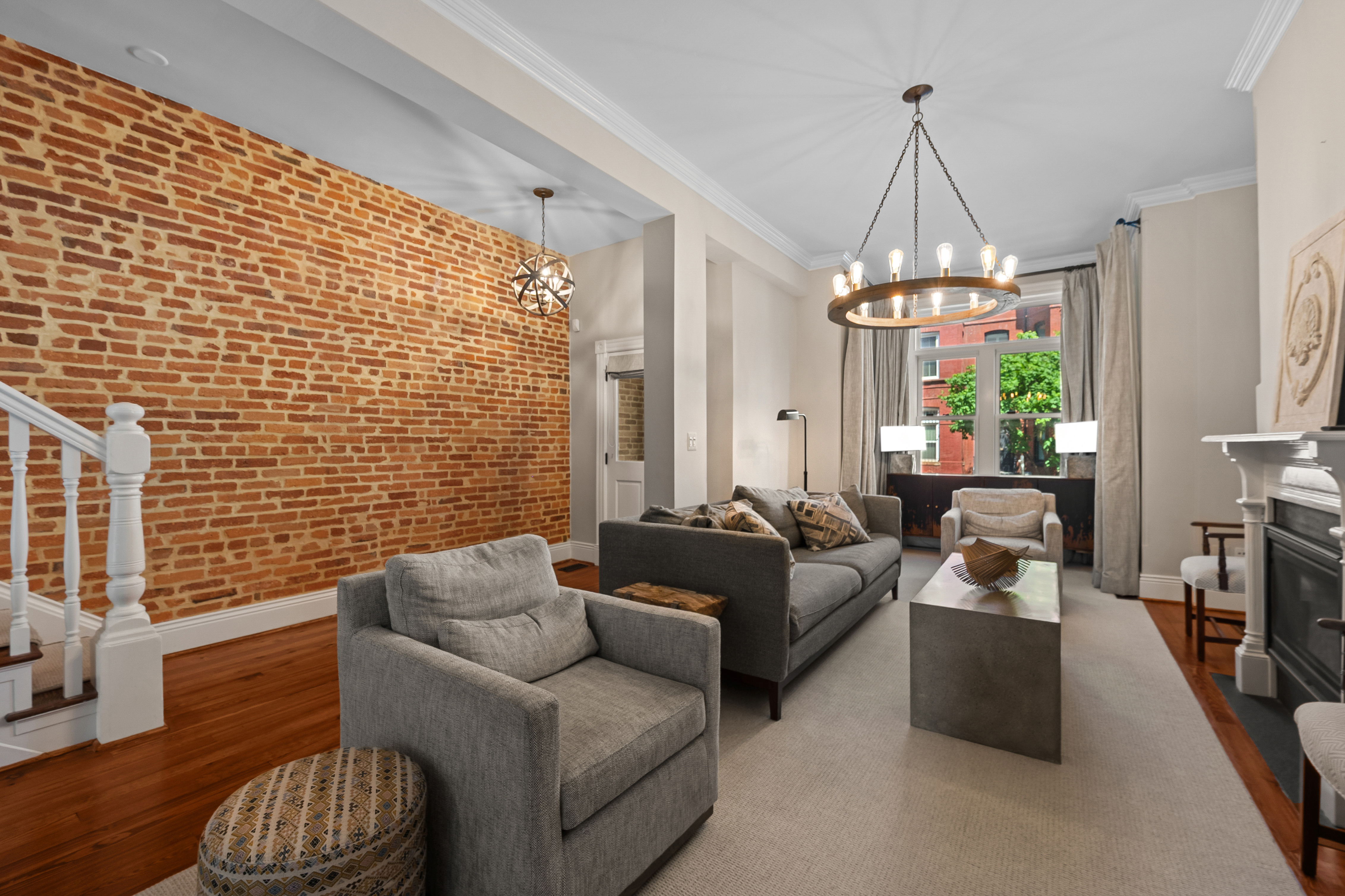 The four-bedroom, three and a half bathroom home showcases a harmonious blend of historic architecture and modern comforts. Hardwood floors ground the spacious rooms, while exposed brick walls add a captivating touch of character. The expansive living area provides ample space for relaxation and entertaining, complemented by the home's generous square footage.