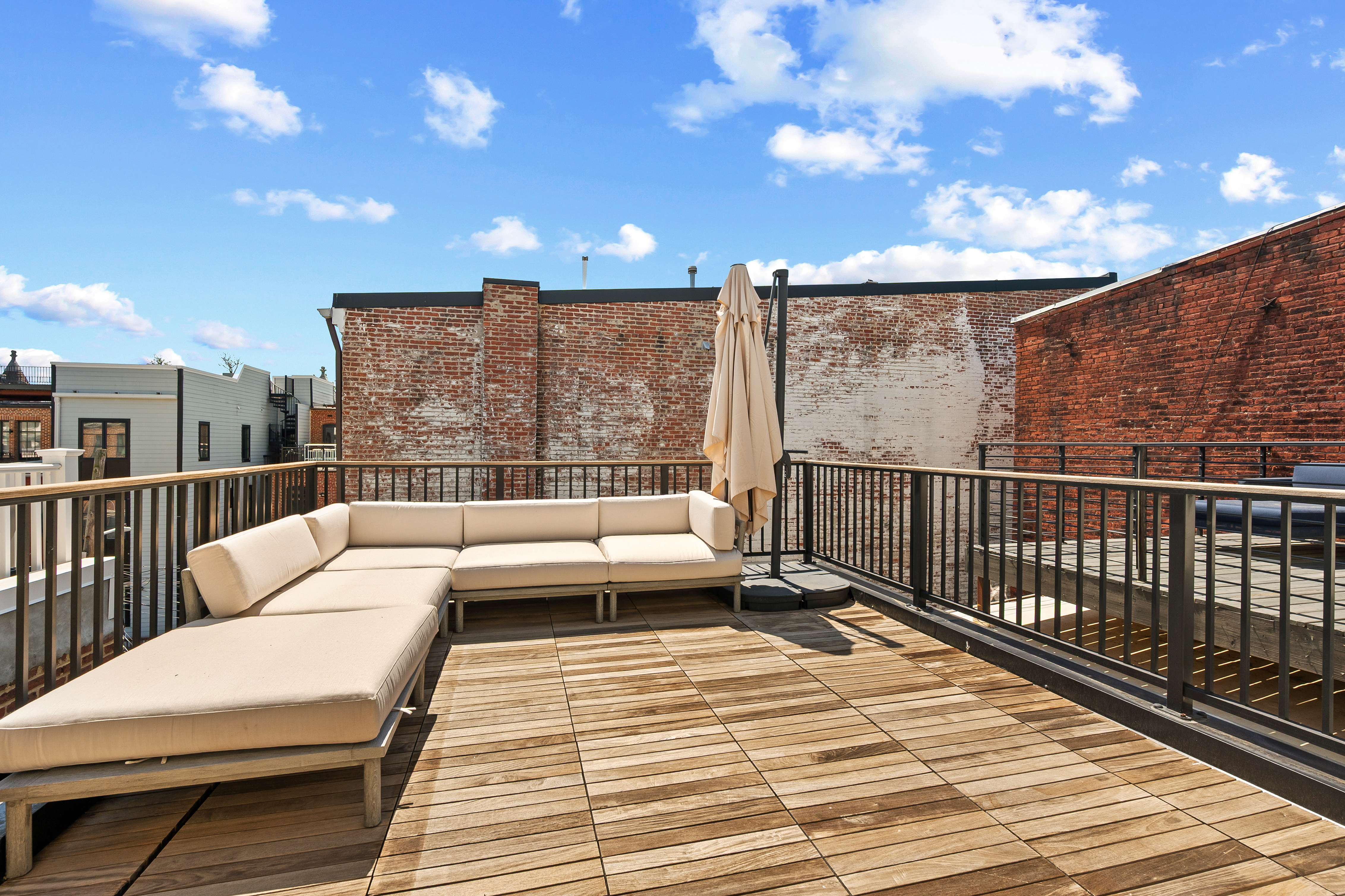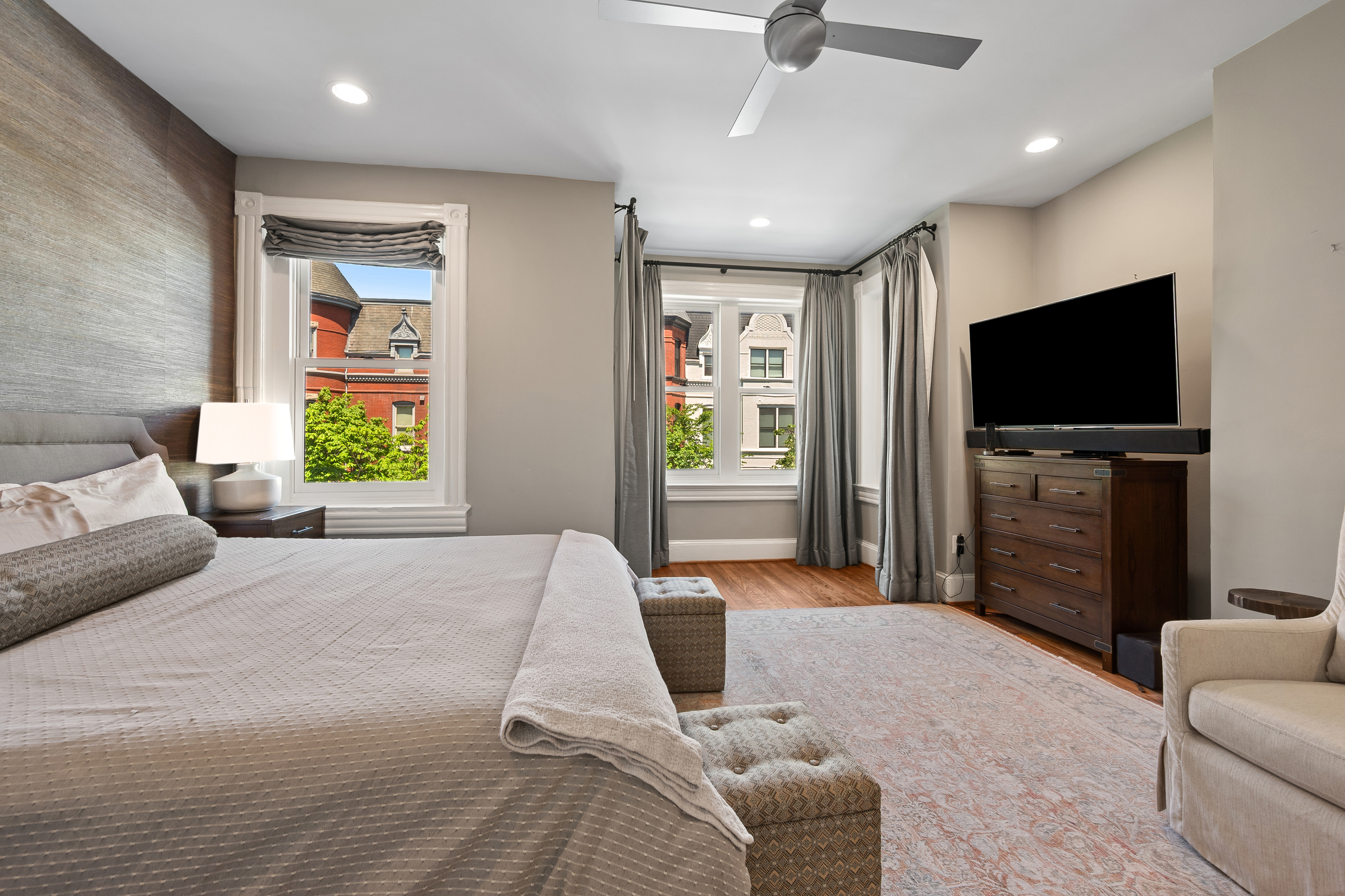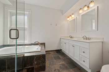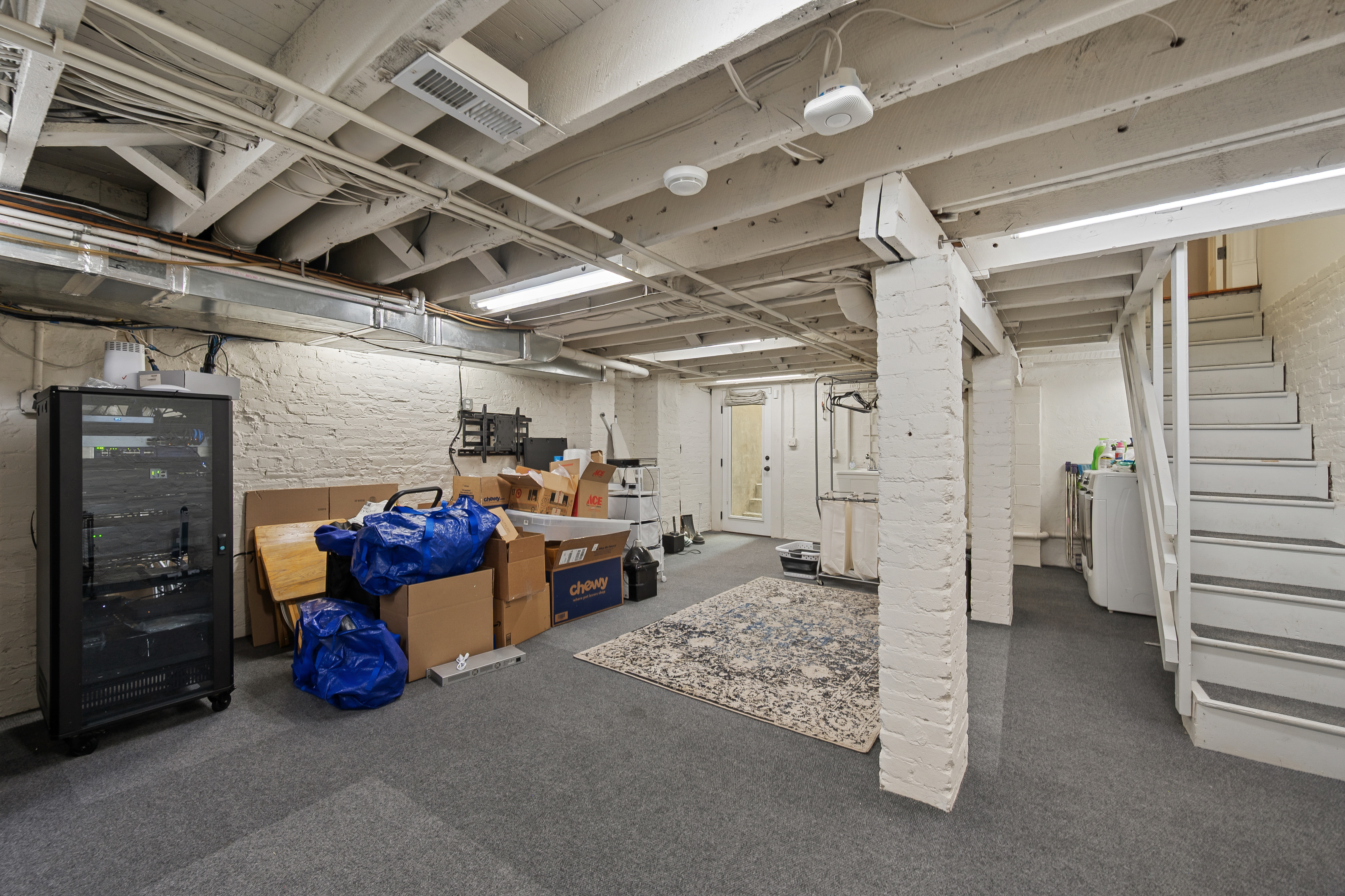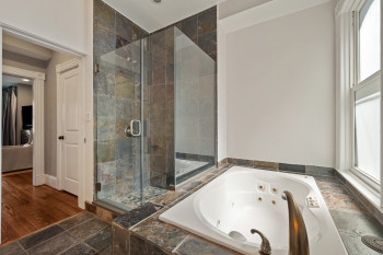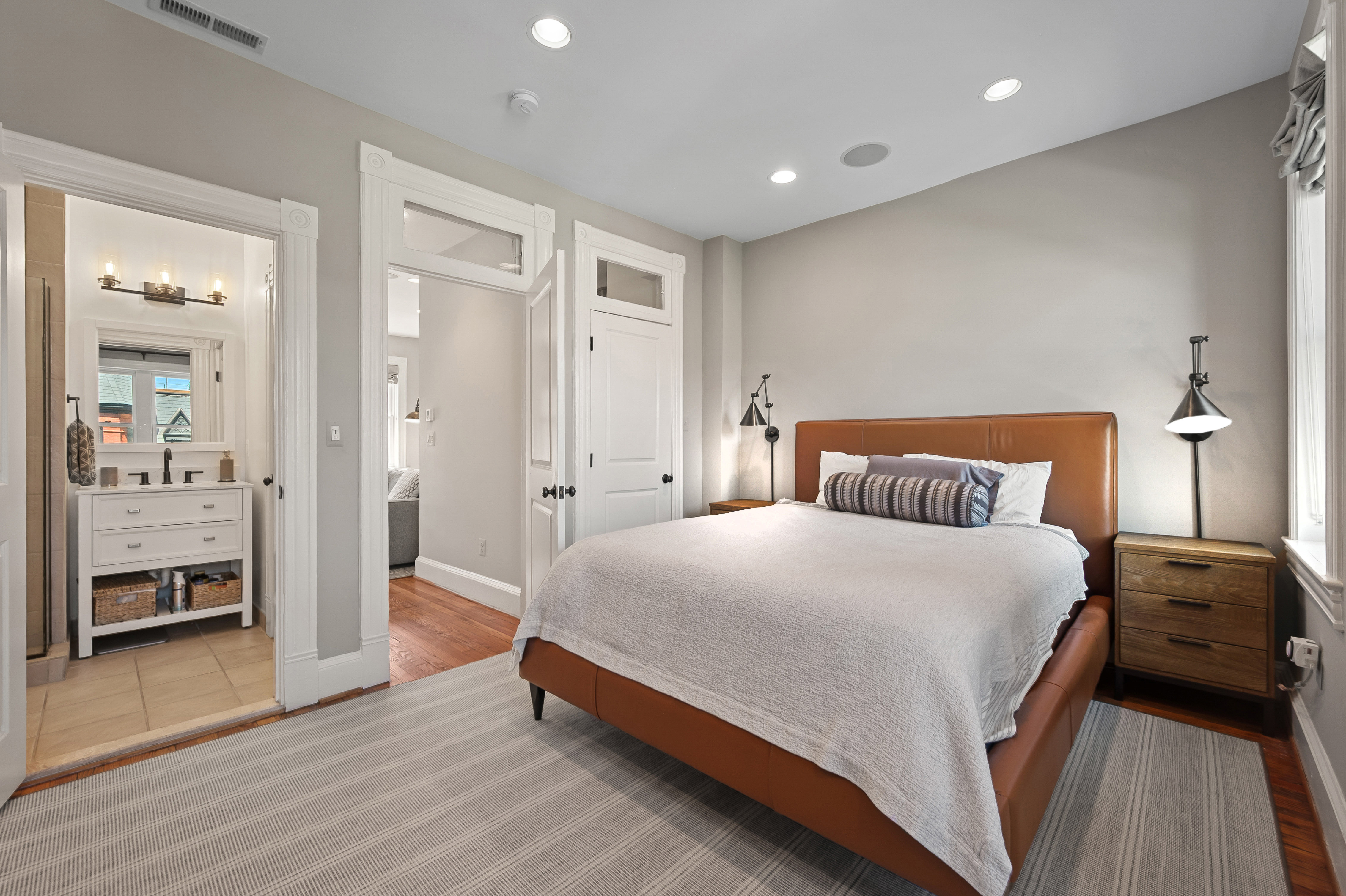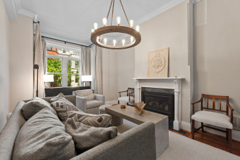 The four-bedroom, three and a half bathroom home showcases a harmonious blend of historic architecture and modern comforts. Hardwood floors ground the spacious rooms, while exposed brick walls add a captivating touch of character. The expansive living area provides ample space for relaxation and entertaining, complemented by the home's generous square footage.