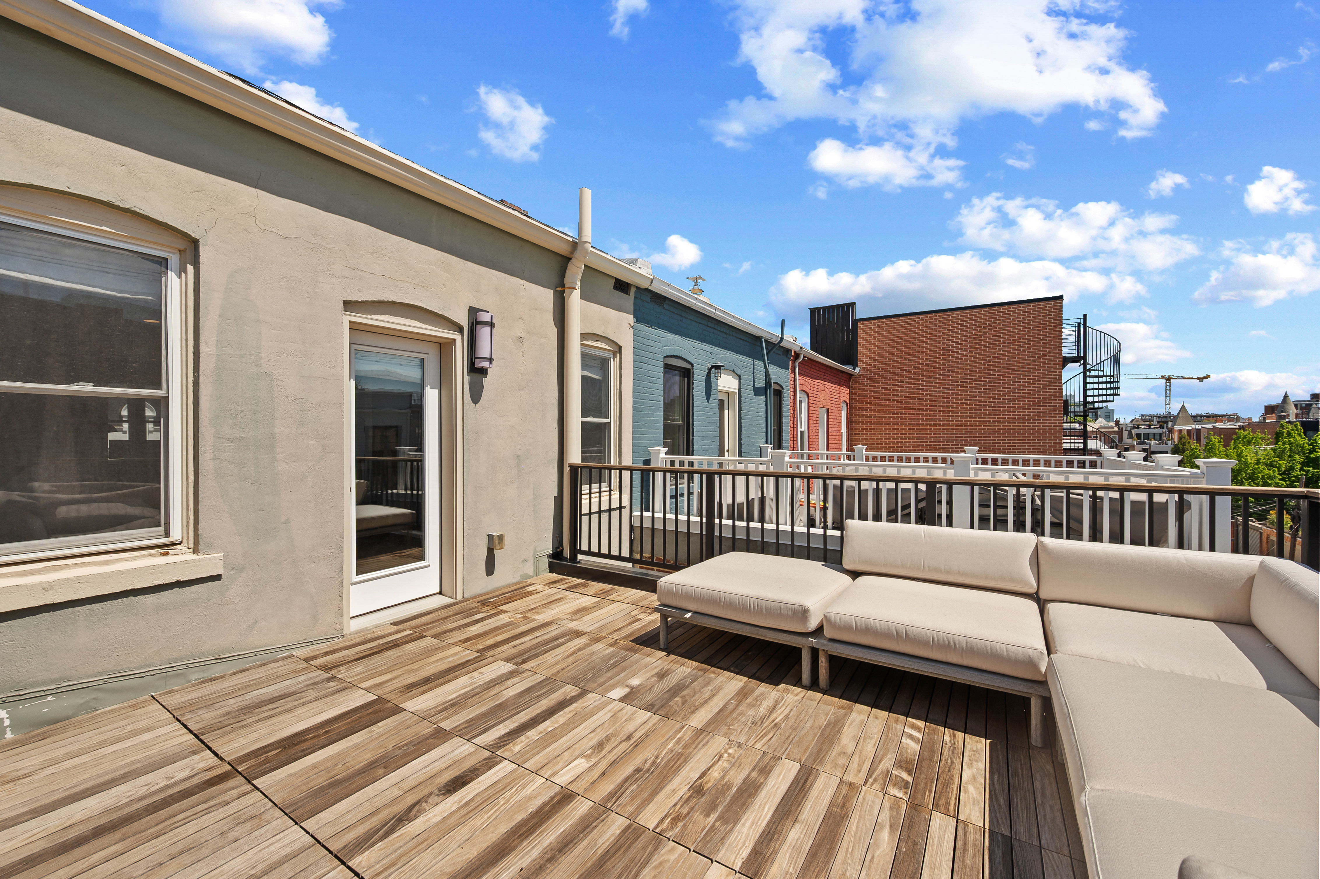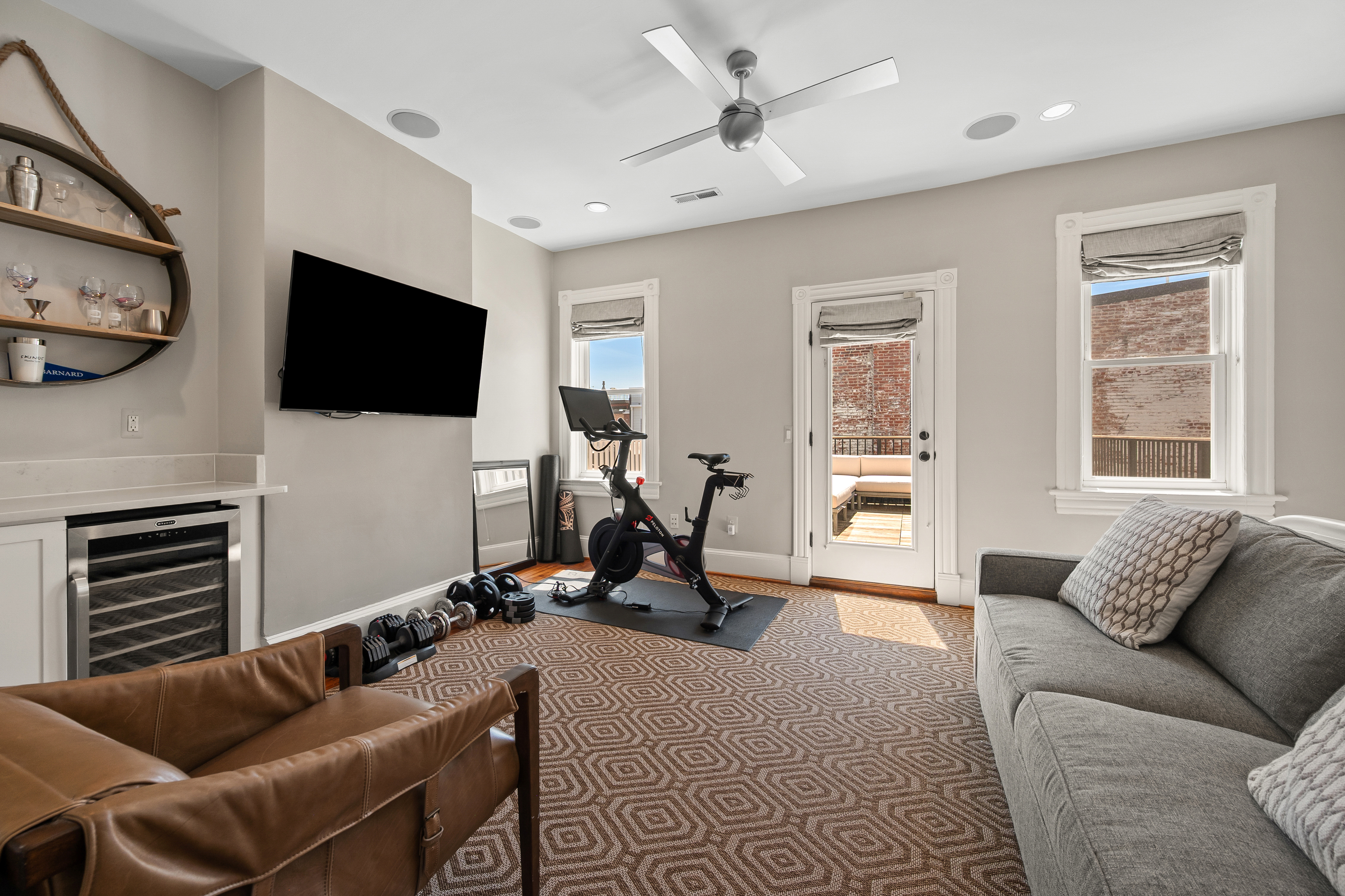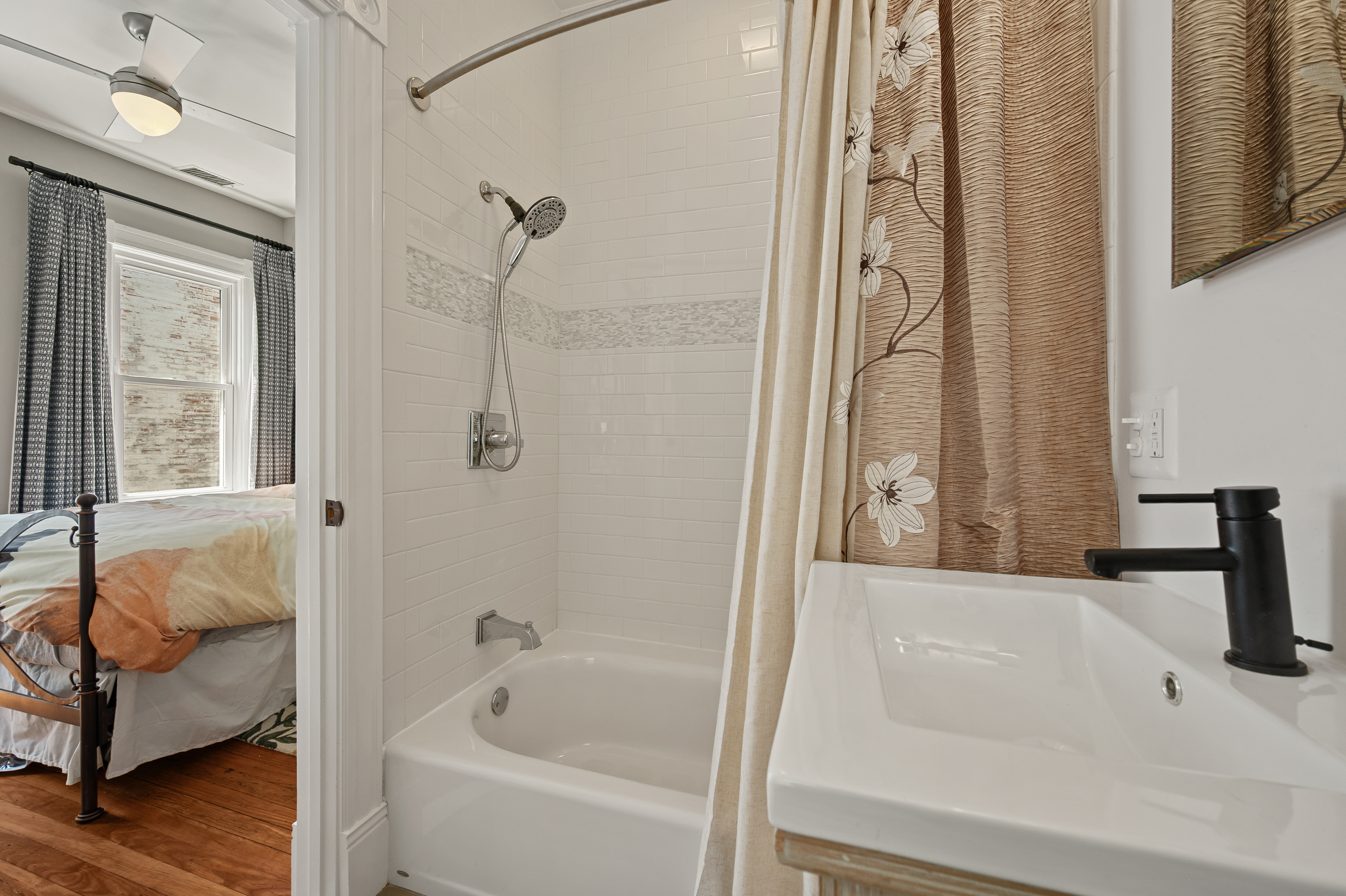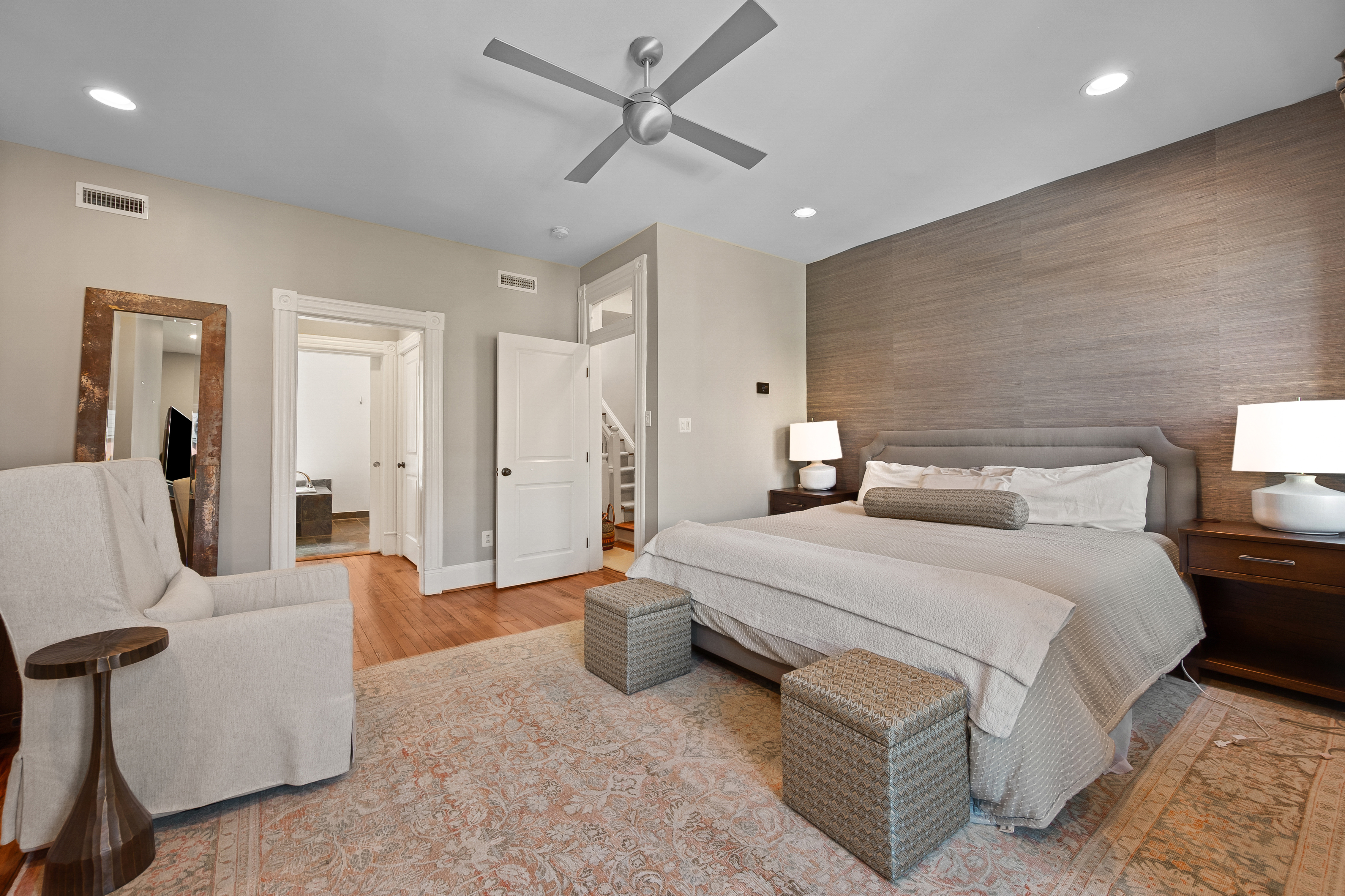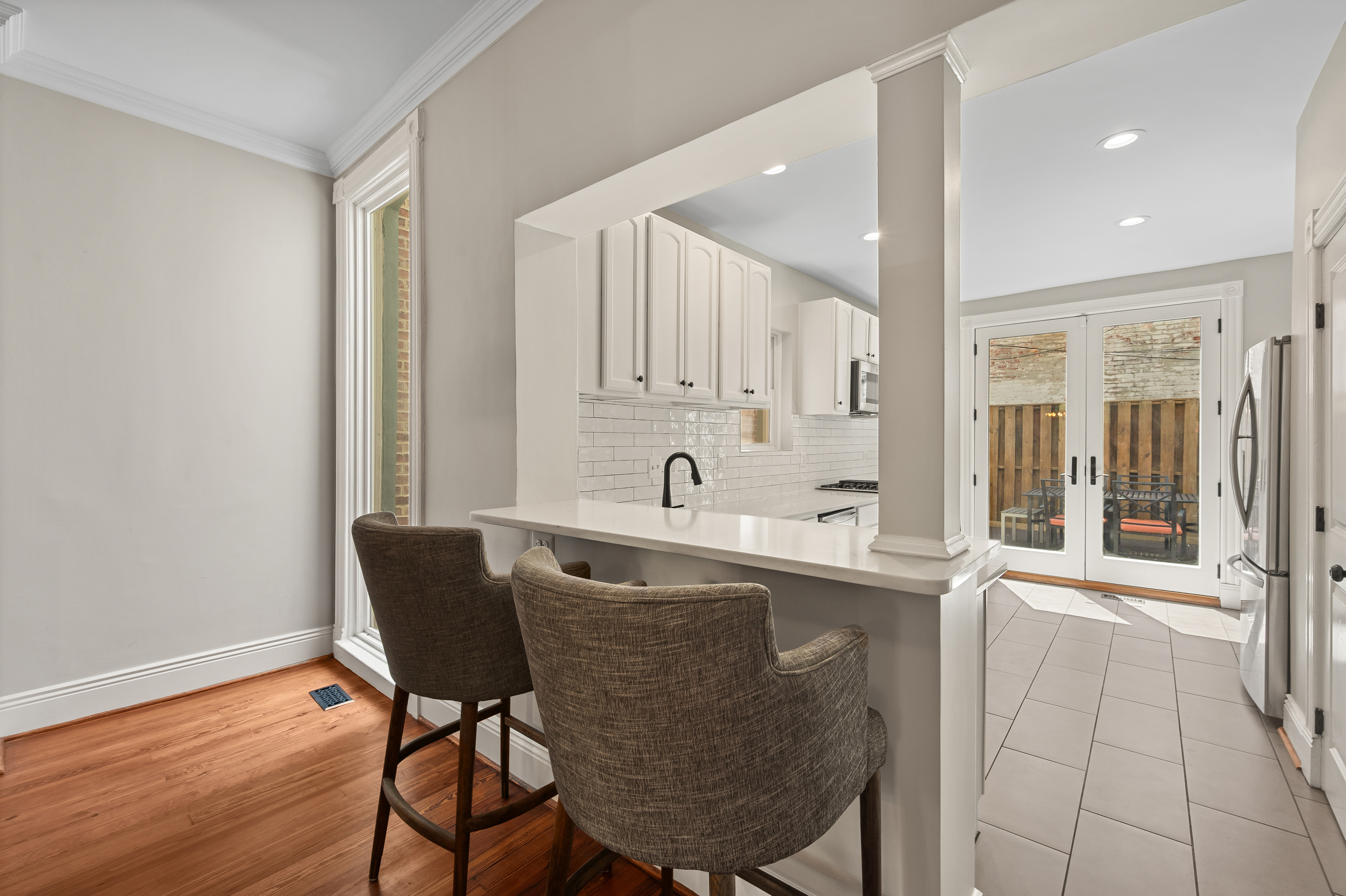 The four-bedroom, three and a half bathroom home showcases a harmonious blend of historic architecture and modern comforts. Hardwood floors ground the spacious rooms, while exposed brick walls add a captivating touch of character. The expansive living area provides ample space for relaxation and entertaining, complemented by the home's generous square footage.