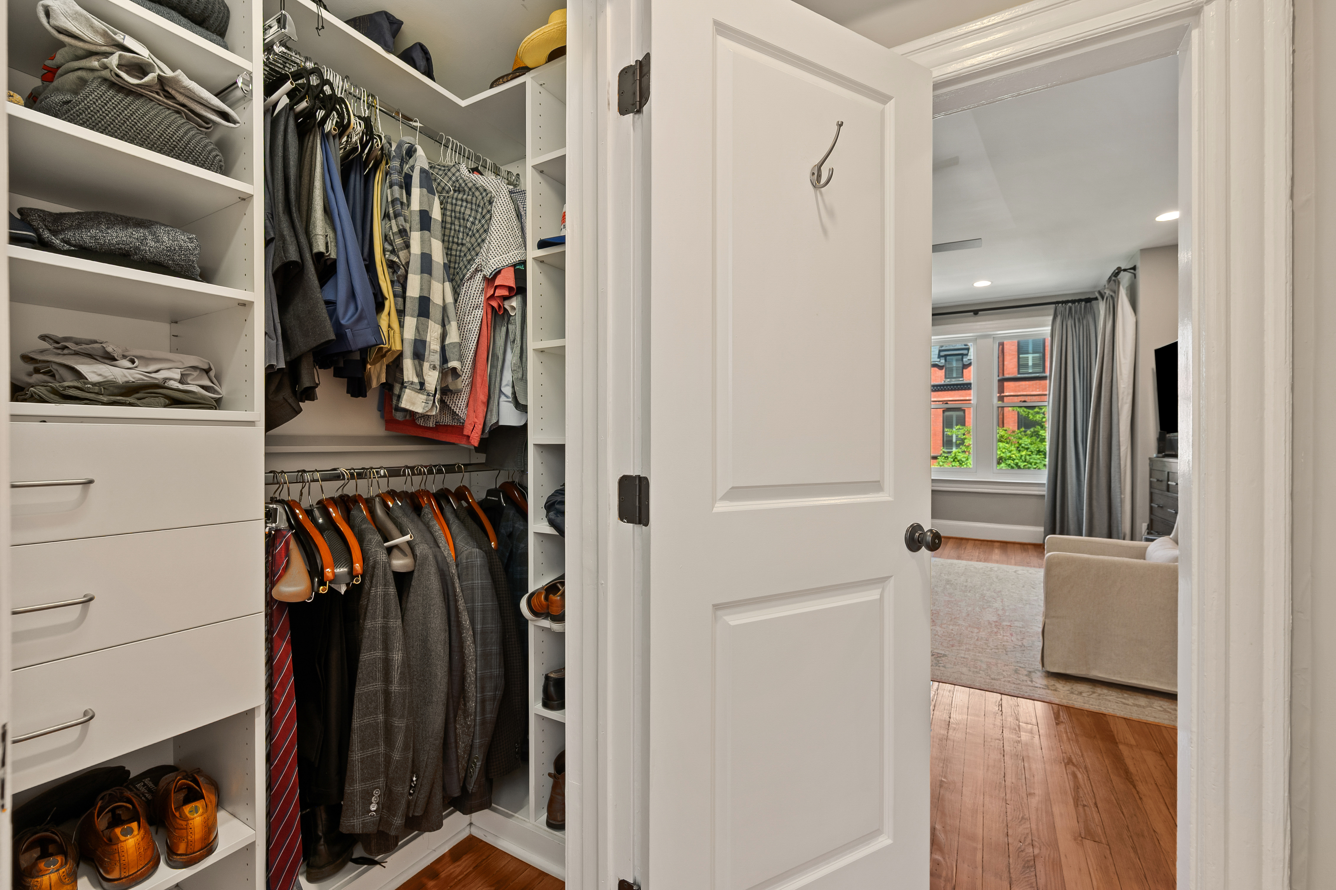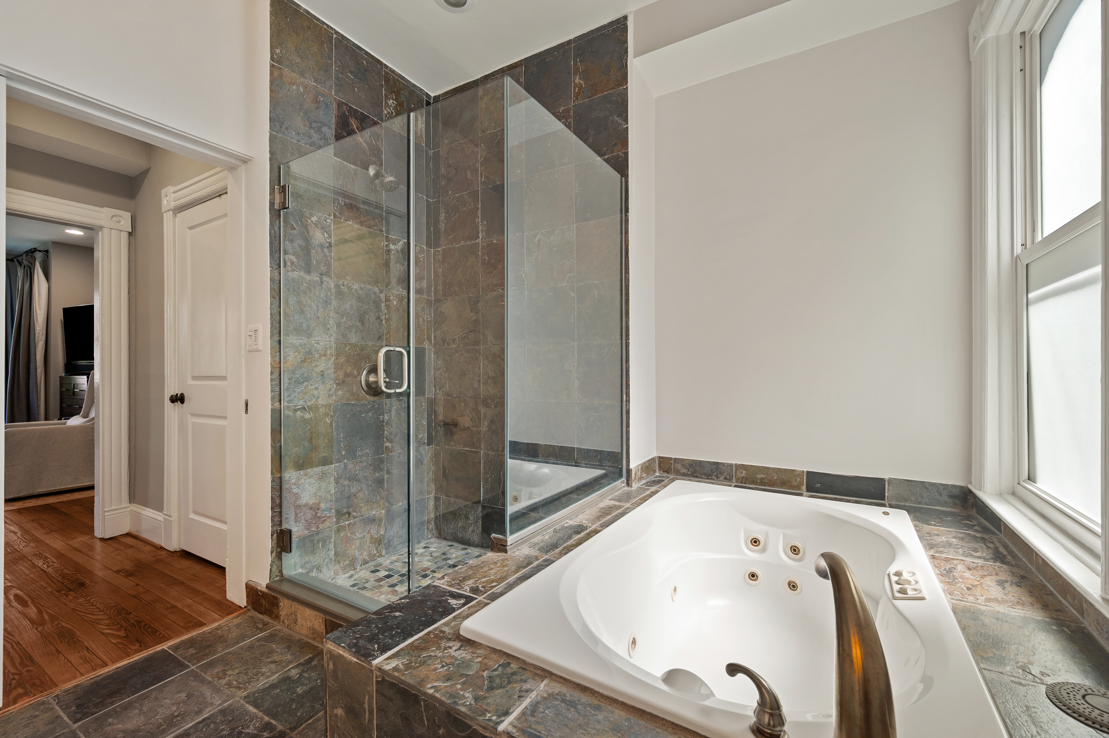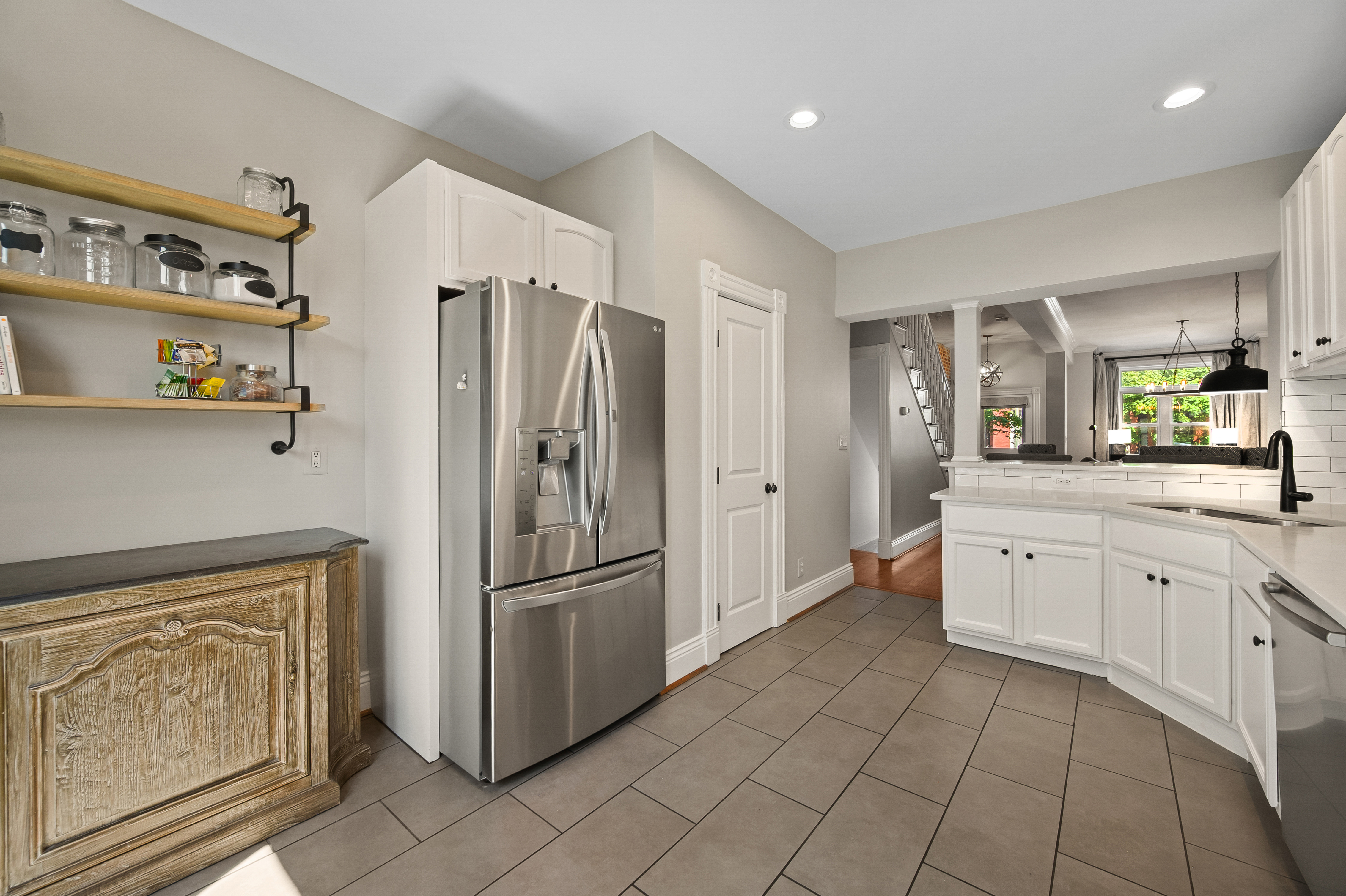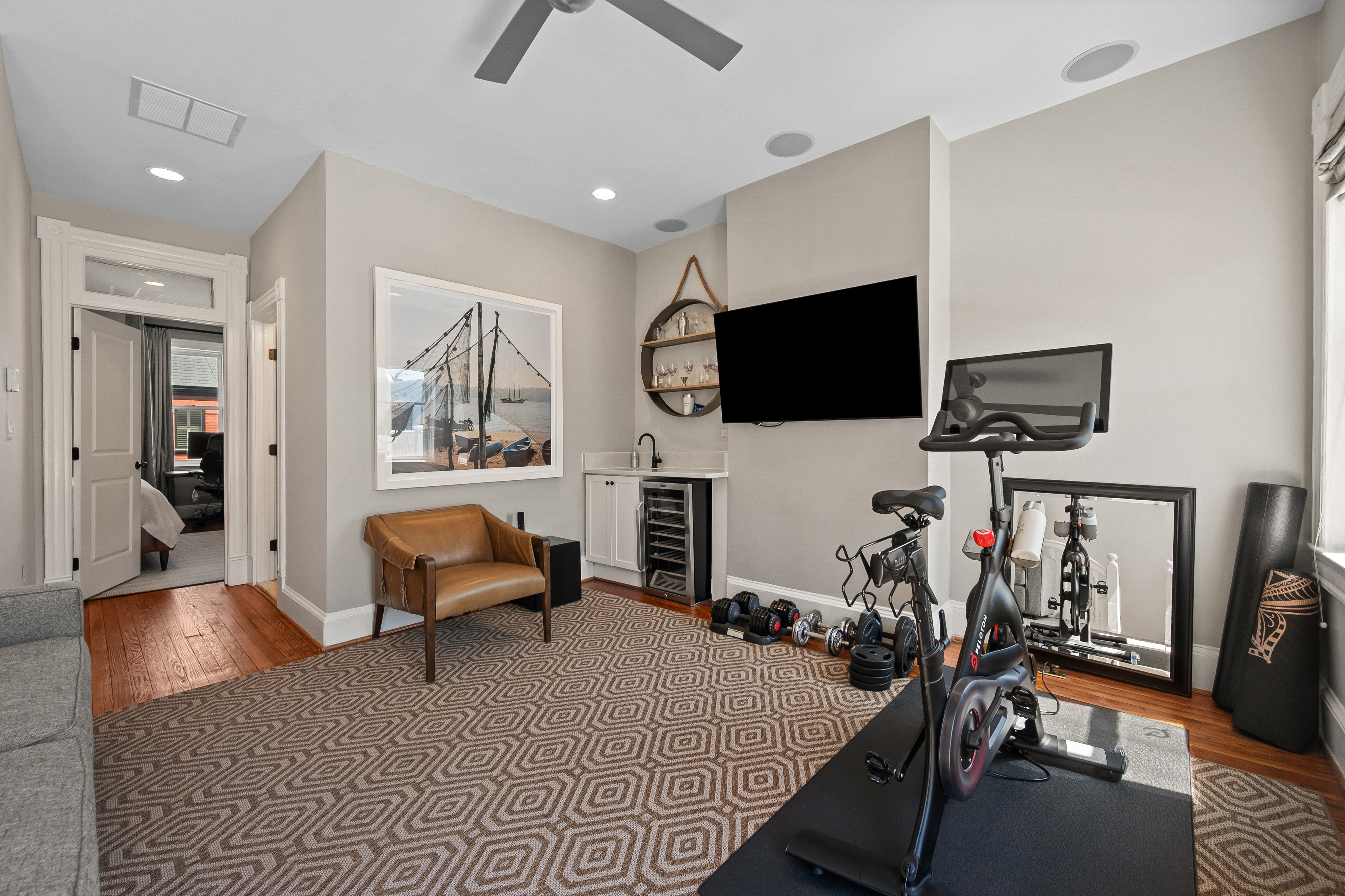 The four-bedroom, three and a half bathroom home showcases a harmonious blend of historic architecture and modern comforts. Hardwood floors ground the spacious rooms, while exposed brick walls add a captivating touch of character. The expansive living area provides ample space for relaxation and entertaining, complemented by the home's generous square footage.