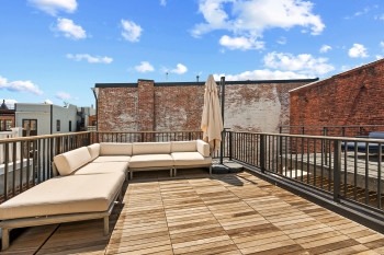 The kitchen is a culinary haven, featuring ample countertops and abundant cabinetry to accommodate every cooking need. The primary bedroom is a true sanctuary, with hardwood flooring and a spacious layout that ensures a tranquil retreat. The luxurious bathrooms are appointed with high-quality finishes, creating a spa-like atmosphere. Beyond the main living areas, this property extends its appeal with a functional basement with room for a bedroom, an inviting outdoor dining area perfect for al fresco meals, and an expansive outdoor living space for relaxation and entertainment. An indoor wet bar adds convenience for hosting, while a spectacular rooftop deck offers panoramic views and an ideal setting for gatherings